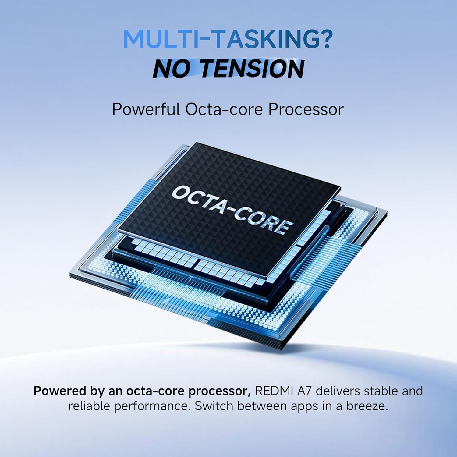 Powered by an octa-core processor, REDMI A7 delivers stable and reliable performance for everyday activities. Whether you're switching between apps, watching videos, or browsing the internet, the phone keeps things running smoothly without unnecessary lag.