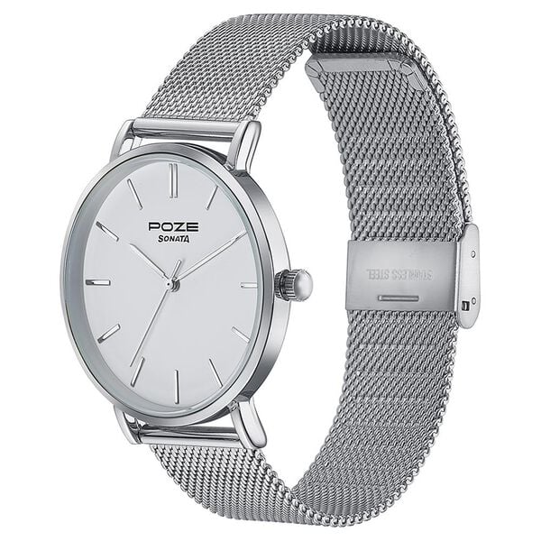 Sonata Poze Quartz Analog White Dial Silver Metal Strap Watch For Men